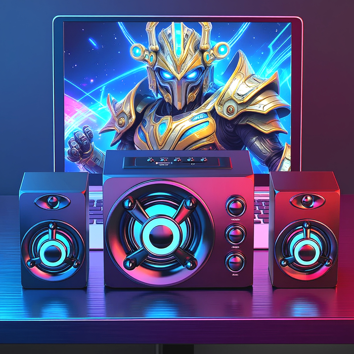 Звук регулируется раздельными ползунками баса и высоких частот, восемь режимов подсветки меняют цвет по выбранному профилю. Вспомогательный выход 3,5 мм подключает дополнительные акустические системы или наушники.