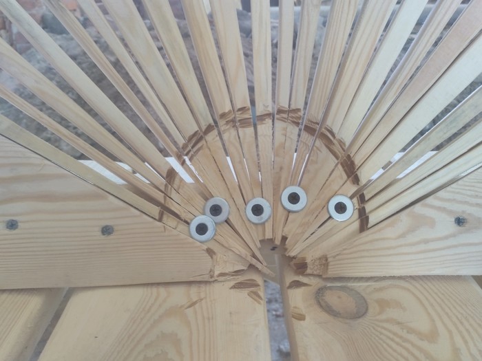 Легко сказать - сидеть не удобно. Решил отталкиваться от формы ракушки и создать что то подобное. Притащил ещё досок, из говна и палок соорудил каркас для циркулярки и начал кромсать материал особо не запариваясь над прямотой и размерами