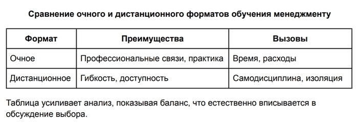 Очное и дистанционное обучение менеджменту по-разному влияют на мотивацию и глубину погружения в материал, что напрямую отражается на эффективности обучения.
