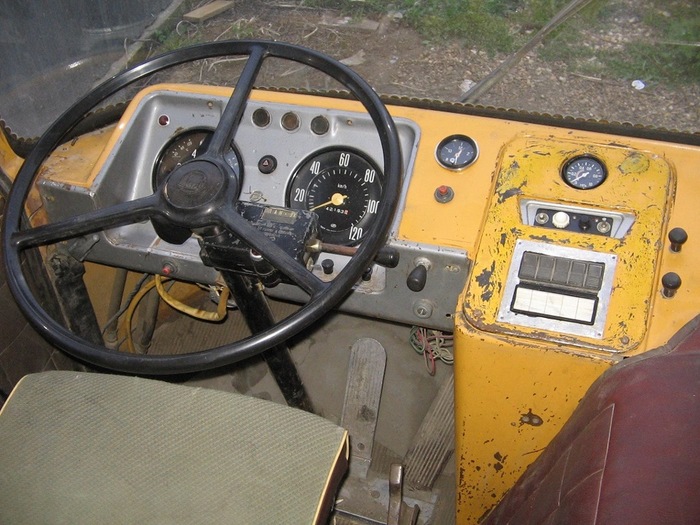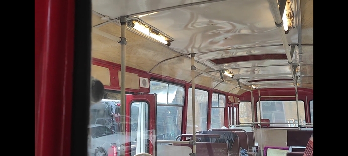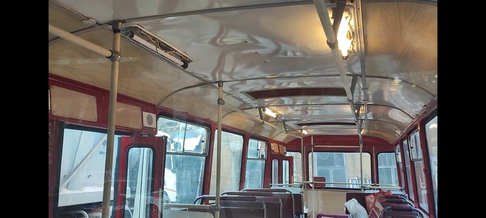 Так работало "дежурное" освещение этого автобуса, которое, по задумке конструкторов, должно было включаться только при заглушенном двигателе. А вот на маршруте с завода работало основное, люминисцентное освещение, салон полностью исправного автобуса выглядел примерно вот так: