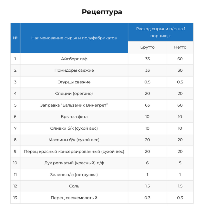 Согласно этой "карте" масса брутто салата "Айсберг" у нас в два раза меньше чем нетто (альтернативная физика, видимо), огурцов на порцию требуется 0,5 грамма, бальзамика (откуда он тут вообще?) 60 граммов (салат при этом будет плавать в уксусе), причем почему-то брутто и нетто бальзамика различается (брутто прямо с бутылкой, надо полагать), орегано 20 граммов (поверх уксуса будет плавать толстый слой орегано, очевидно). Мда, результат будет просто несъедобный. Откуда такая техкарта взялась трудно сказать, но очевидно что сайтом этим пользоваться категорически нельзя. Интересно, что этот сайт желает продавать сборники рецептур за деньги. Не дай Бог такое купить. Пошли дальше.