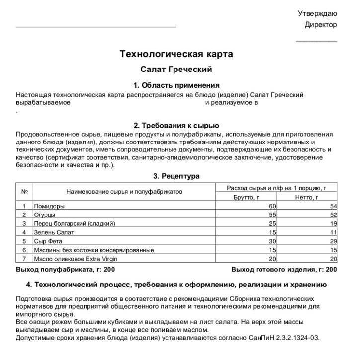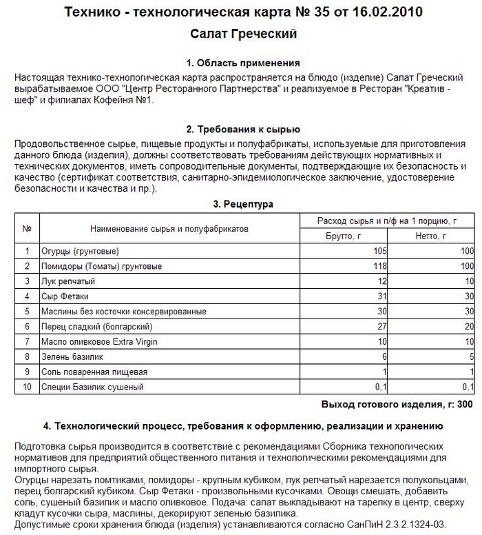 Количества тут по-крайней мере правдоподобны, уже радует. Правда выглядит это всё как творение первокурсника кулинарного техникума. Что за "Салат" непонятно - видов зелёных салатов существует огромное количество. Орегано и лук, которые в оригинальном салате почти обязательны тут не кладут. Про то, что огурцы положено чистить тоже забыли. Нюансы вроде того, какими "большими" кубиками резать овощи, как вообще подавать сыр тут опущены. В целом по такой рецептуре готовить можно, если некоторые вещи повар сможет додумать самостоятельно, но выйдет "салат из овощей с сыром" достойный непритязательной столовой. Что характерно, этот сайт предлагает услуги разработки меню для ресторанов и кафе. Если они разрабатывают вот так, как в этой карте, то я не завидую их клиентам.