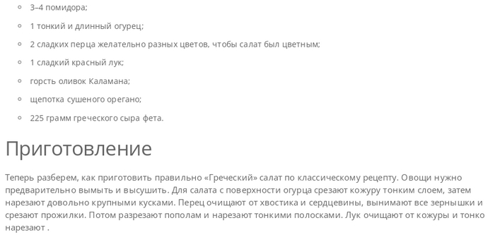 Тут есть и просто рецепты, и картинки, и технологическая карта. В "просто рецептах" всё неплохо, тут есть и орегано, и сорт оливок, и про чистку огурцов не забыли.