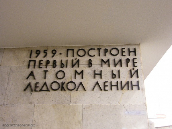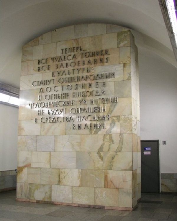 Раньше торец центрального зала был станции был украшен цитатой В.И.Ленина:"Теперь все чудеса техники и завоевания культуры станут общенародным достоянием, и отныне никогда человеческий ум и гений не будут обращены в средства насилия".
