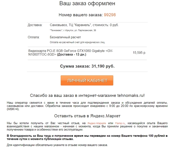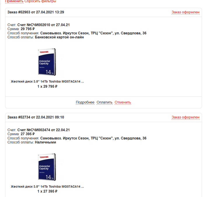 22.04.2021 года заказал в магазине Техномакс (tehnomaks.ru они же mirussia.ru) жесткий диск объемом 14ТБ (мамкин chia-майнер, да) за 27'395. Хотел расплатиться наличными при получении, но менеджер, позвонивший для подтверждения заказа, сообщил что нужна 100% предоплата чтобы заказать товар у поставщика и поставить в резерв. Окей, выставили счет, пришло письмо на почту, перейдя по ссылке в котором я его оплатил.