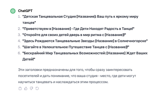 Пример запроса: “Создай несколько заголовков уровня H1 для первого экрана сайта”