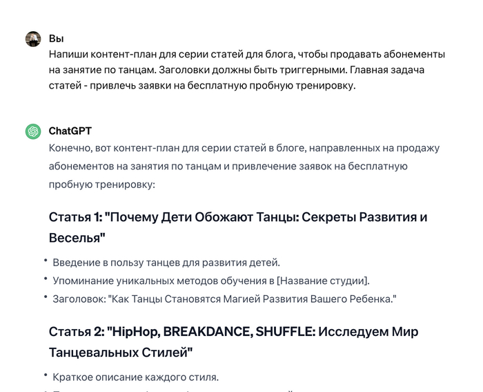 “Напиши контент-план для серии статей для блога, чтобы продавать … Заголовки должны быть триггерными. Главная задача статей - привлечь заявки на …"