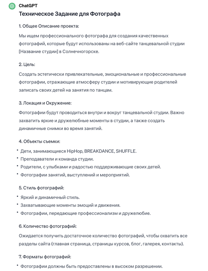Пишем так: “Напиши тз для фотографа, чтобы он сделал подходящие снимки для всего сайта”