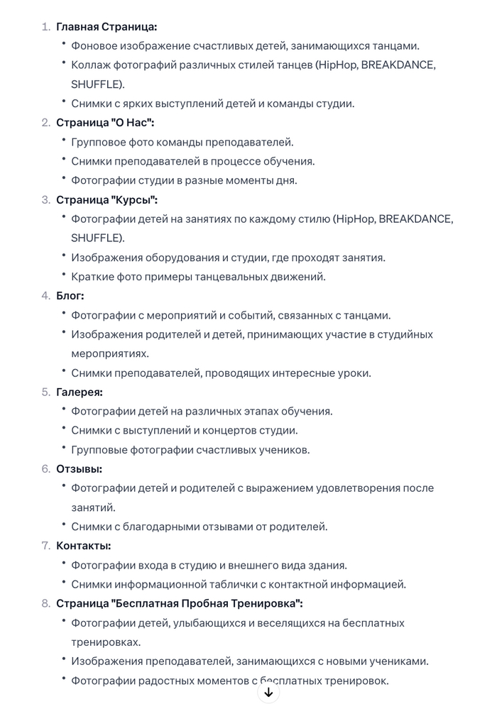 Далее можем конкретизировать наш запрос: ”Напиши по пунктам в какие места нашего сайта нужны фото и что должно быть на них”