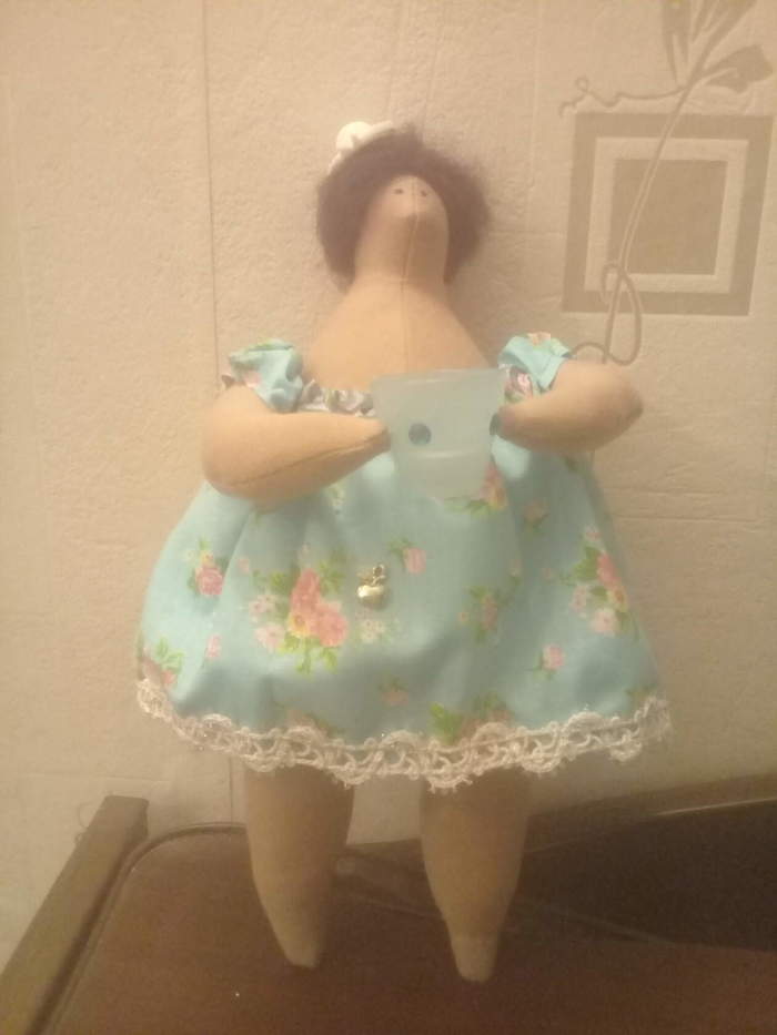 Материалы, использованные для пошива куколки: хлопок, холлофайбер, трикотаж.