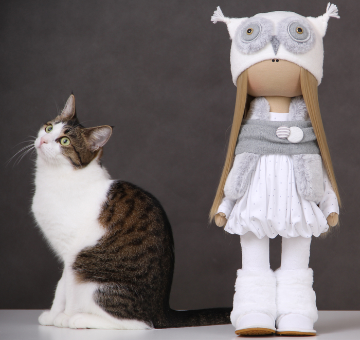 Рост девочки - 48 см. Тело из трикотажа "белый ангел". Набивка - холлофайбер. Пятна нарисованы акриловой краской для ткани.
