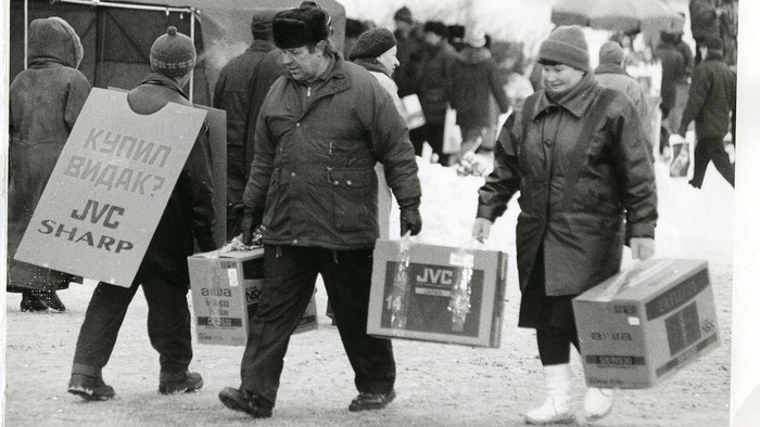 Семья возвращается с покупками с рынка, 1990-е годы.