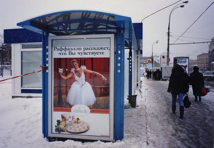 Реклама конфет «Рафаэлло» на остановочном комплексе. Россия, 1990-е годы.