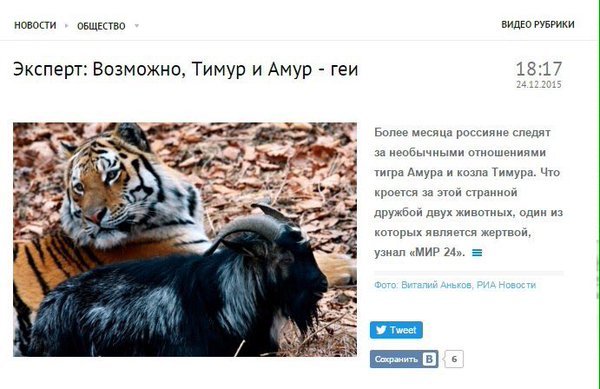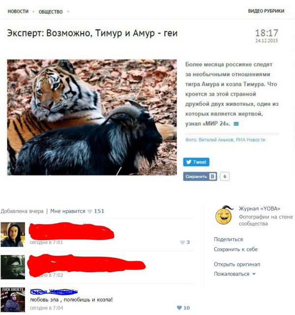 Козла никто не научил бояться тигра. И Амур решил не связываться с таким смелым козлом, есть его не стал. Мало того, козёл выжил Амура из собственной спальни и сам спит на его месте уже четвёртые сутки. Амуру пришлось перебраться на крышу убежища. Назвали смельчака Тимуром, это достойное имя для такого бесстрашного животного. Днём Амур и Тимур дружно выходят в большую вольеру и гуляют вместе. Тимур принял Амура за вожака, и всюду следует за ним.