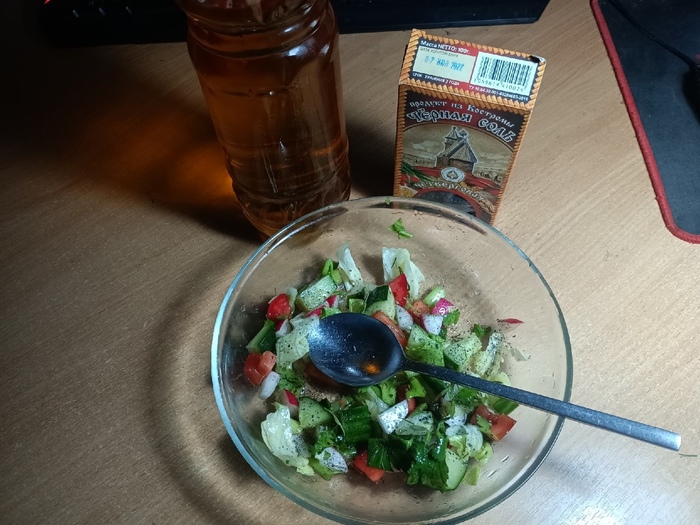 Для вкуса пряное масло надо лить совсем чуть-чуть, с этих бутылочек оно льётся очень тоненькой струйкой. И солим исключительно нашей черной Костромской четверговой солью.(можно и обычной, просто у нас она обыденная, и салату дает дополнительный интересный вкус).