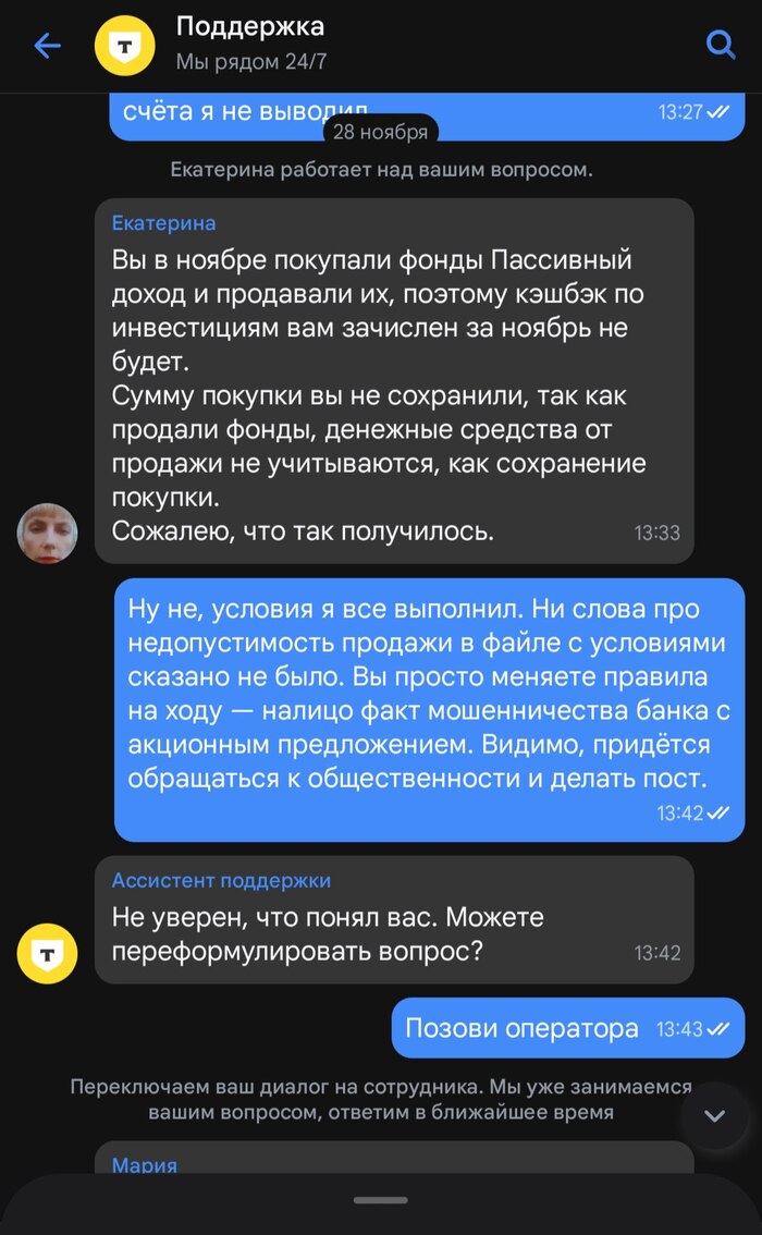 Данный пост не является отзывом в Т-банке или призывом не пользоваться его сервисами. Наоборот, я являюсь клиентом Т-банка (ранее "Тинькофф банка") уже 7 лет и впервые сталкиваюсь с полной некомпетентностью сотрудников банка и глупыми попытками отписаться от моих вопросов.