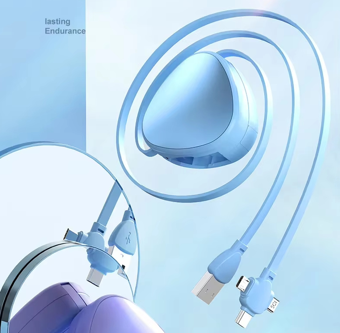 Выдвижной кабель сочетает в одном корпусе три типа разъёмов — Micro-USB, Type-C и Lightning. Механизм смотки позволяет аккуратно убирать провод внутрь катушки, предотвращая спутывание и заломы.