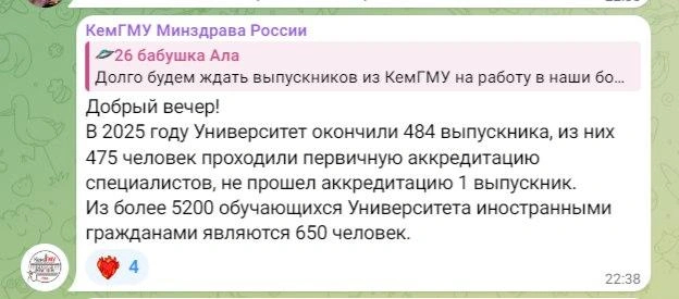 Статья взята с информационного агенства NG42 RU Кемеровско- Кузбасским СМИ. Для любителей пруфов, и достоверной информации вот ссылка на оригинал статьи https://ngs42.ru/text/health/2025/08/27/76002398/ Переживающая непростое время медицина Кузбасса получила в этом году очередной удар под дых — тотальное сокращение бюджетных мест в КемГМУ ради пополнения числа целевиков — тех, кому придется отработать пять лет в больнице, но обучаться будет бесплатно. Кемеровчанка Екатерина в своей колонке рассказала, как это, скорее всего, приведет к сокращению числа толковых специалистов и почему уже сейчас врачи гуглят симптомы на приеме пациентов.Лента новостей принесла прекрасное — сразу два поста на одну и ту же тему. Сначала министр здравоохранения Андрей Тарасов доложил, что завершилась приемная компания в Кемеровский медуниверситет и медколледж с указанием числа поступивших, затем, что Минздрав России планирует убрать бюджетные места для будущих медиков, оставить только платные и целевые.