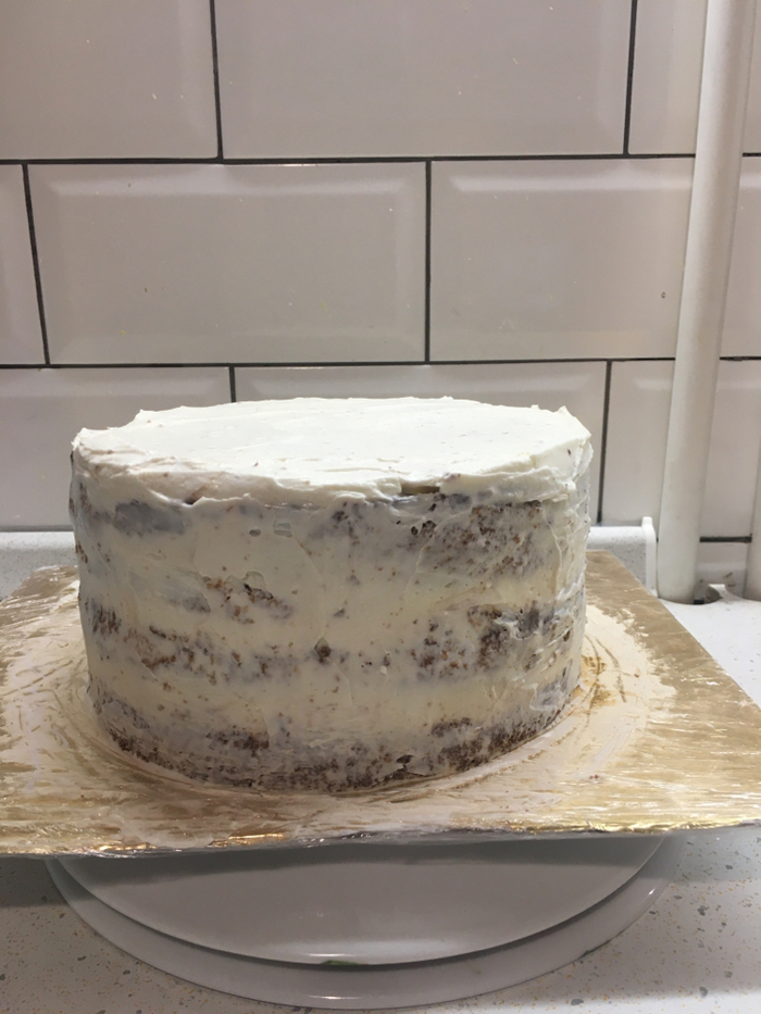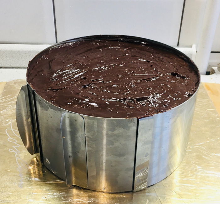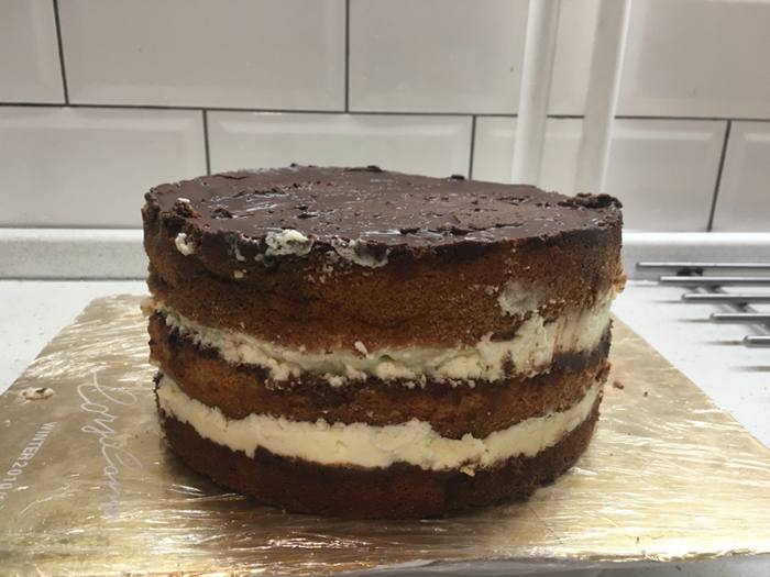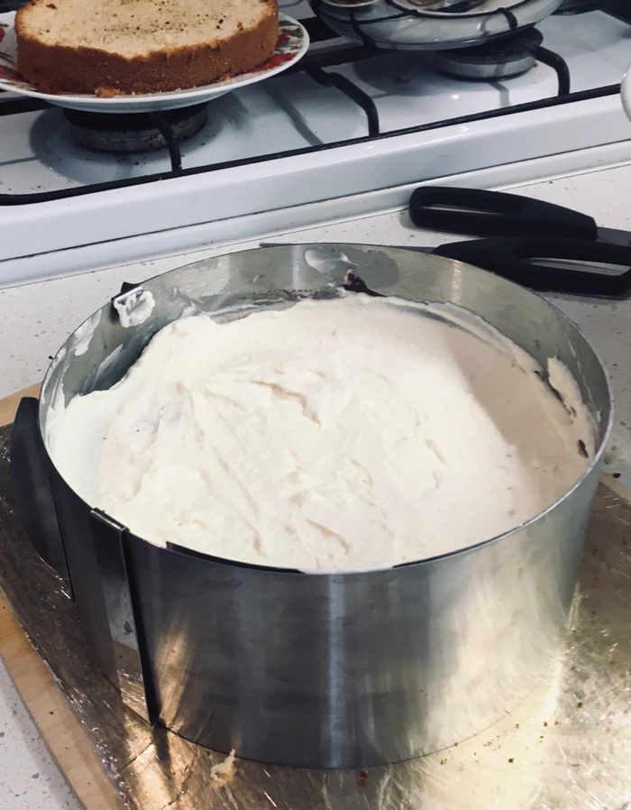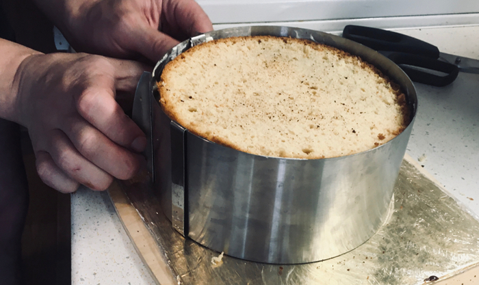По готовности, оставляем остывать в форме и после остывания разрезаем на две половинки. Одну из них обильно смазываем абрикосовым джемом.