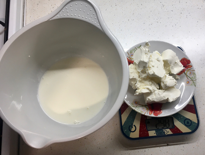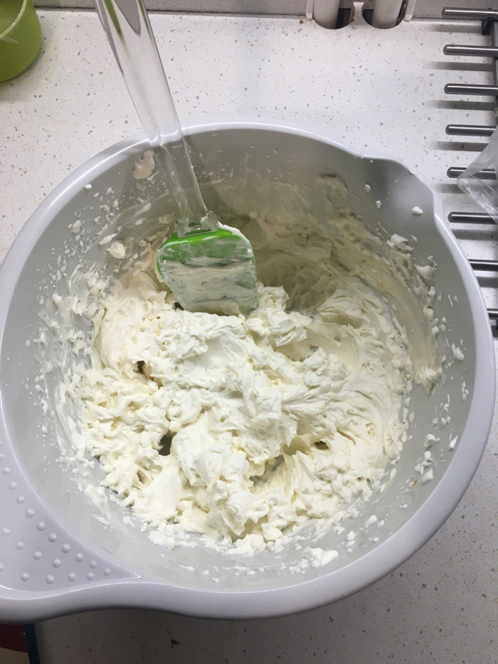 Приготовление крема мы начинаем с желатина. Его нужно замочить в небольшом количестве воды на 10 минут. Взбиваем сливки с сахаром. Желатин отжимаем, пластинки перекладываем в кастрюлю, добавляем немного маскарпоне и чууууть-чуть подогреваем, чтобы желатин растворился. Основную часть маскарпоне мы смешиваем с сахаром, ванильным сахаром, соком лимона. И добавляем растворенный желатин. Крем готов.