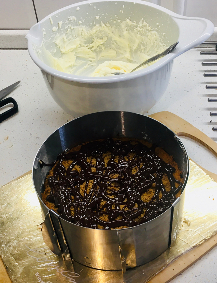 На песочное тесто, смазанное абрикосовым джемом мы выкладываем половинку бисквита, без джема. Поливаем его эспрессо, по желанию- ликером. Сверху- абрикосовый джем, половину крема. Накрываем половинкой бисквита, которую мы заранее смазывали джеом, и вкладываем оставшийся крем. Отправляем в холодильник минимум на 3 часа.