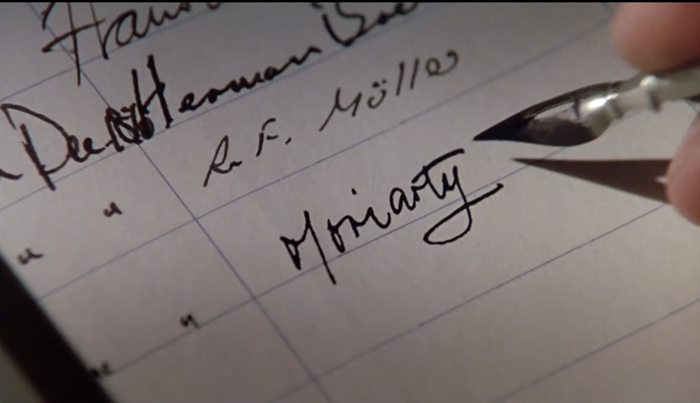 И, заселяясь в швейцарский отель, он указывает свое имя — Мориарти (отсылая к заклятому противнику Шерлока Холмса)