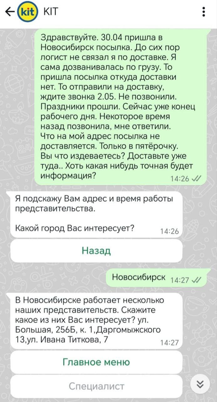 Хочу публично обратить внимание на недопустимое качество сервиса ТК «КИТ». 18 апреля 2025 года была отправлена посылка из Сочи в Новосибирск. По трек-номеру СОЧНВ30118978967 груз прибыл в Новосибирск 29 апреля на этом все хорошее закончилось.