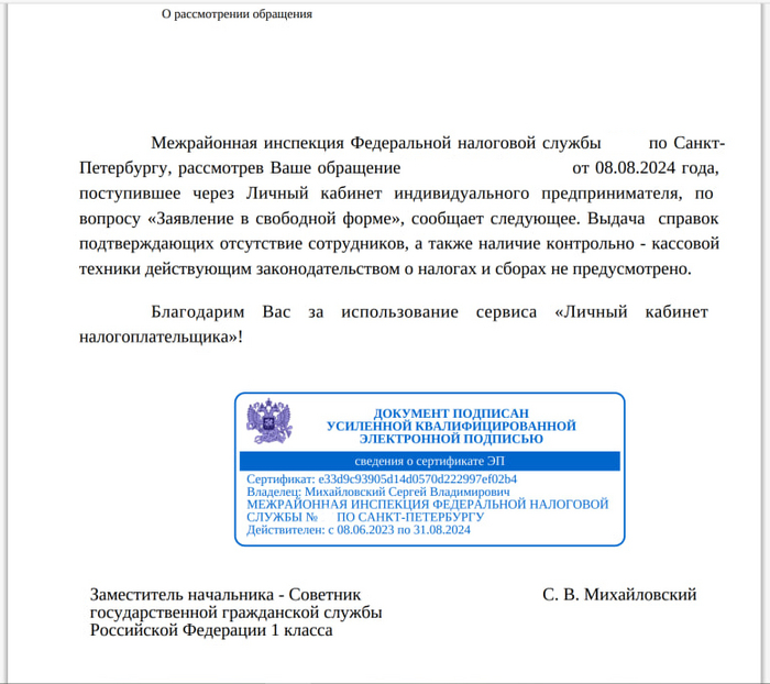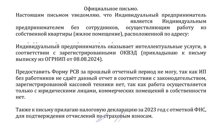 На мой вопрос – почему я должна доказывать всю эту информацию, если это всё есть в свободном доступе по моему ИНН – мне ответили, что в СПБ и Лен области несколько тысяч ИП и они уж точно не собираются всё проверять, а если я не хочу платить, значит потрачу своё время и предоставлю документы.