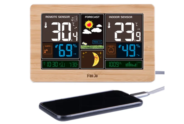 Многофункциональные часы с термометром, гигрометром и погодным прогнозом. Показывает время, дату и прогноз в цвете. Устанавливается на стол или крепится на стену.