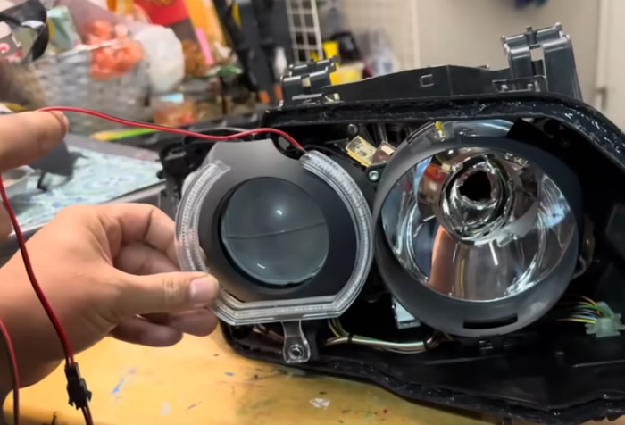 Установка выполняется изнутри, поэтому фару необходимо аккуратно разобрать. После подключения проводов кольца начинают светиться вместе с габаритами или ближним светом.
