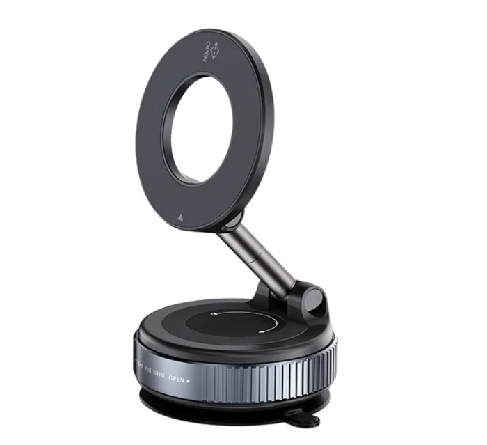 Гелевая присоска надёжно сцепляется с торпедо, стеклом и даже умеренно шероховатыми панелями, а подпорный винт добавляет фиксацию. В верхней части установлен мощный магнитный узел, который мгновенно подхватывает смартфон в чехле и держит его уверенно на кочках и в поворотах.