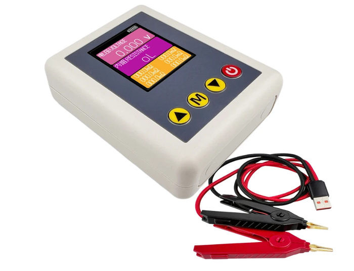 Яркий цветной дисплей выводит ключевые параметры в удобной форме, а управление осуществляется через понятные кнопки, что делает работу с прибором максимально комфортной. В комплекте предусмотрены зажимы и USB-кабель для подключения, обеспечивающие стабильный контакт при проверке.