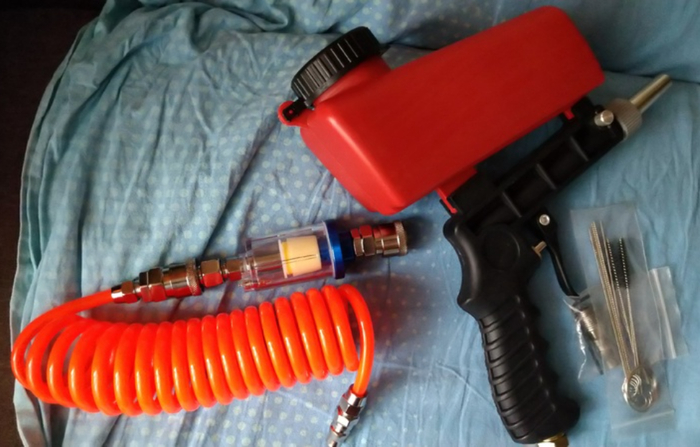 Инструмент для эффективной очистки поверхностей от краски, ржавчины или загрязнений. Работает по принципу подачи смеси воздуха и абразивных частиц, которые с высокой скоростью ударяются о поверхность, удаляя верхний слой. Объём бака составляет около 500 мл, чего хватает для длительной работы без дозаправки.