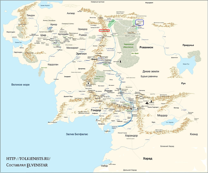Казалось бы простой вопрос относительно не дальнего полёта уже вызывает у повелителя орлов несогласие и он твёрдо отказывает Гендальфу. Мне сейчас сложно сказать какую равнину имел в виду Гендальф, но зная что их путь лежал к Одинокой горе, а они сейчас находились в Мглистых горах, к северу от Ривенделла, это могут быть лишь два места, я выделю их на карте зелёной штриховкой: