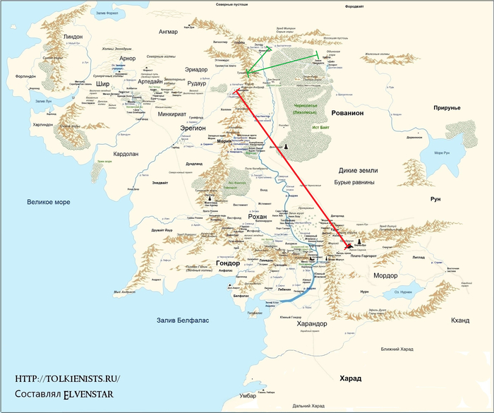 Зелёные линии это предполагаемые маршруты по которым орлы могли бы отвезти Гендальфа, Бильбо и гномов в "Хоббите", но отказались. Красная линия это путь от Ривенделла до Огненной горы и даже без линейки заметно что она чуток подлиннее будет :) И это полёт по прямой, мимо всяких приятных мест вроде Дол Гулдура, которые думаю даже орёл предпочёл бы облетать стороной. А значит в реальности линия была бы не прямой и расстояние вышло бы значительно длинней. Все дни (или ночи, что вероятней) полёта хоббиту пришлось бы лежать плашмя на гладкой спине птицы, стараясь не сильно хватать её за перья, но при этом не упасть вниз. Ведь никакой орёл не позволил бы превратить себя даже в подобие ездовой лошади, а значит о верёвках не может быть и речи, не говоря уж о седле. Теперь представьте что во время этого путешествия на хоббита и орла совершается нападение, долго хоббит продержится на спине птицы? Да, ведь Саурон знает про не дружелюбных к нему орлов и у него есть своя авиация: