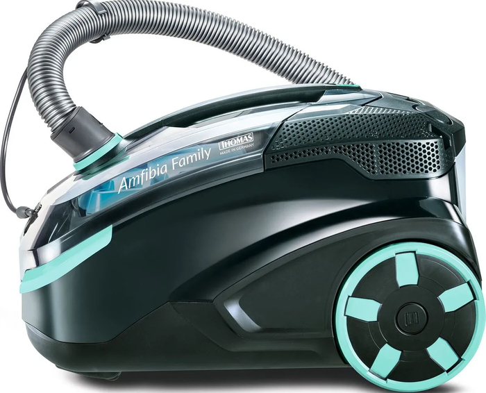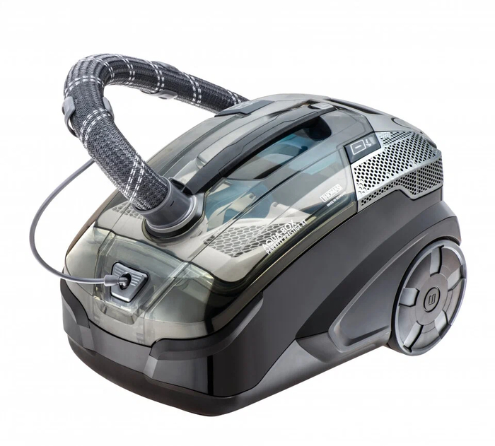 Главная «фишка» — двойная система: хочешь — пылесось водой, хочешь — ставь DryBox и забудь про сушку. Внутри три режима мощности, тяга 325 аВт. Насадки перекрывают всё: от ковра до дивана и ламината. Радиус 11 м, шланг с подачей моющего, бак для шампуня 1,8 л.