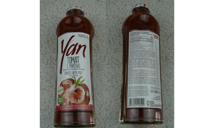 Сок томатный восстановленный из пасты. Информацию о мякоти не нашел, но странно томатный сок и без мякоти. С солью. Без сахара. Изготовитель ООО "Ярцевский комбинат алкогольных и безалкогольных напитков" МО г. Пушкино, они же выпускают 7 heaven. Простая упаковка без многоразовый крышки. Цена 38 рублей. Объём 1 литр. Ph 4.1. Плотность 0.