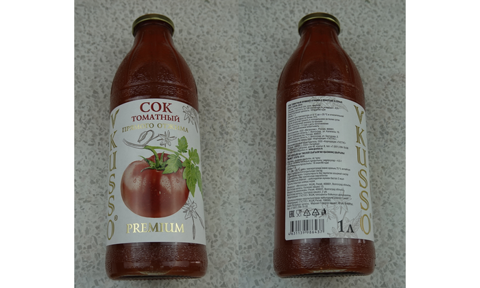 Сок томатный восстановленный из пасты. С мякотью. С солью. Без сахара. Изготовитель ООО "Южная соковая компания" Краснодарский край. Она же делает Дары Кубани, сок торговой марки Лента. Цена 70 рублей. Объём 1 литр. Все понятно и ничего лишнего. Ph 3.9. Плотность 4.