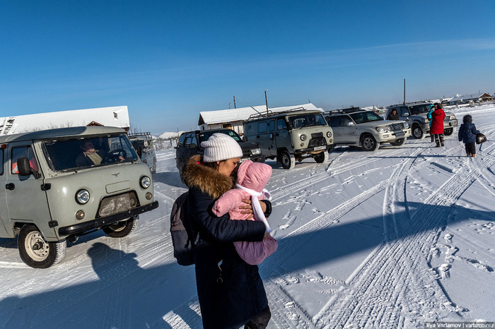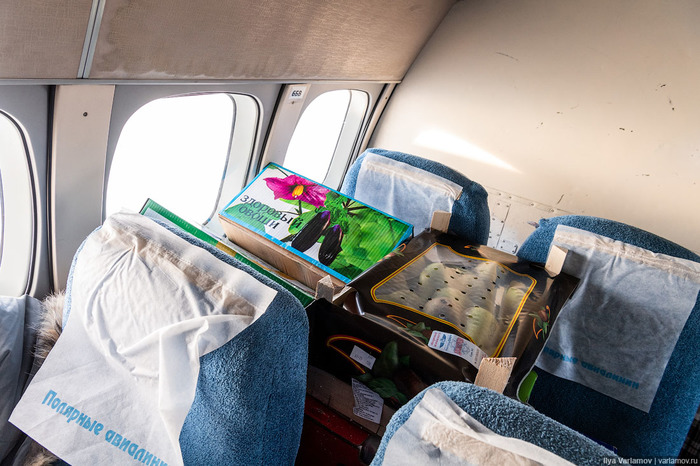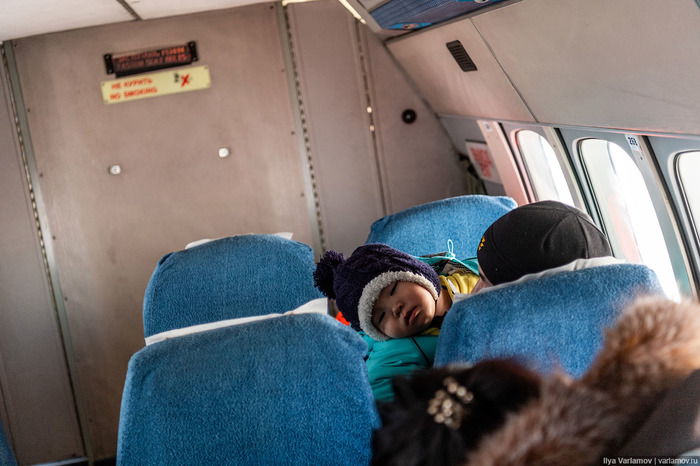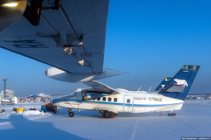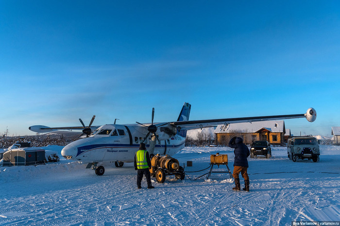 08. В аэропорту нет никаких строений для обслуживания пассажиров, так что встречающие ждут в машинах прямо на краю полосы. Если тебя никто не встречает, то всё, замерзнешь тут и умрёшь прямо перед самолетом. Ещё забавно, что поскольку в Томторе зимой нет людей и всё закрыто, посадочные тоже не выписывают. Поэтому посадочные на обратный перелёт выписывают в Якутске! Естественно, нет никаких досмотров и проверок.