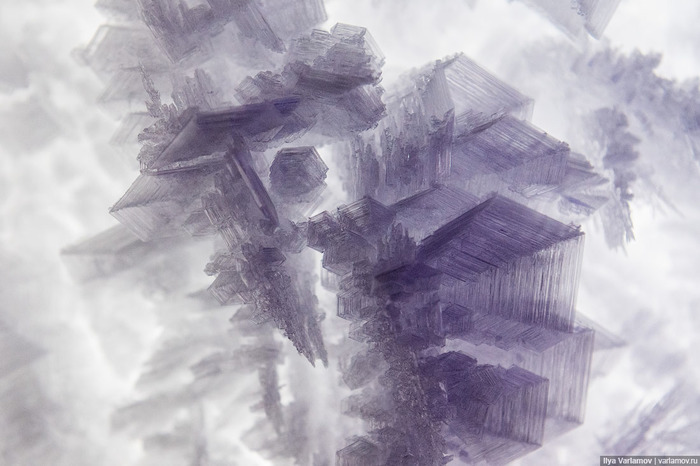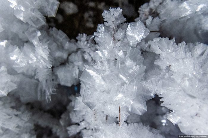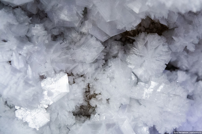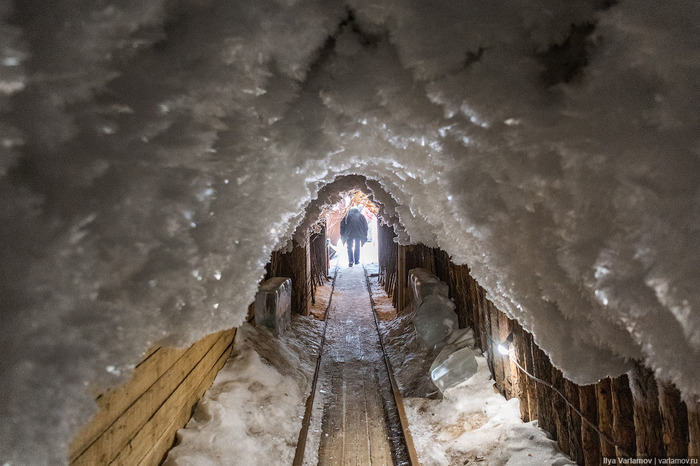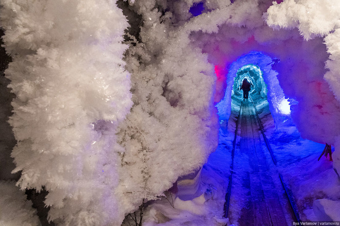 17. В галерее невероятно красивые ледяные кристаллы. На полу остались старые рельсы, по которым в бывшей шахте раньше ходили вагонетки.