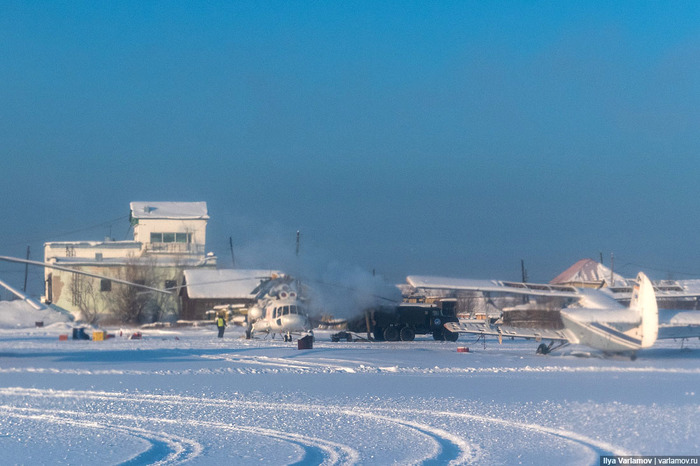 01. До Оймякона добраться не так просто. Зимой нет регулярного авиасообщения, так как летать дорого, и народ едет туда на машинах, а это 928 километров до Якутска (20 часов с учётом паромной переправы, как показывает Гугл) и 1008 километров до Магадана (23 часа). Ближайший посёлок, куда есть регулярные рейсы из Якутска, – это Усть-Нера, но оттуда тоже 11 часов ехать до Оймякона. Но если очень повезёт, можно попасть на чартерный рейс ;) Летают туда самолеты "Полярных авиалиний" из аэропорта Маган. Перед тем как завести двигатель самолёта или вертолёта на морозе, его надо отогреть.