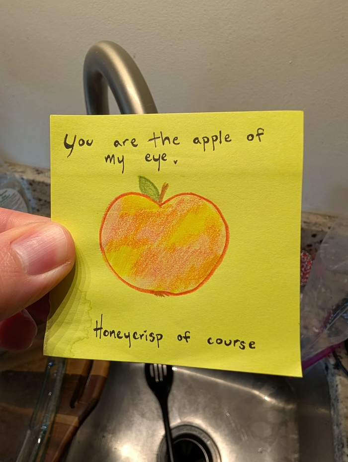 Ты — свет моих очей (apple of my eye). Конечно же, Ханикрисп». (Honeycrisp — популярный сладкий сорт яблок, название можно перевести как «Медовый хруст»)