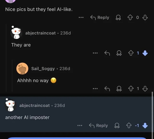 Комеентатор: «Хорошие снимки, но они ощущаются как ИИ (сделанные нейросетью)».