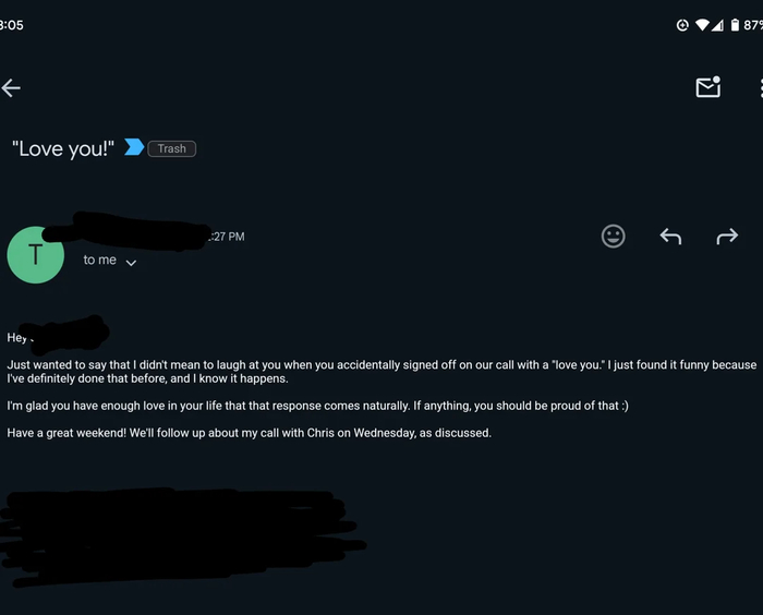 2. Вчера случайно сказал «Люблю тебя!» в конце разговора с важным клиентом. Я услышал, как он хихикнул, когда я вешал трубку, и был готов сквозь землю провалиться от стыда. Сегодня я увидел, что он прислал мне вот это