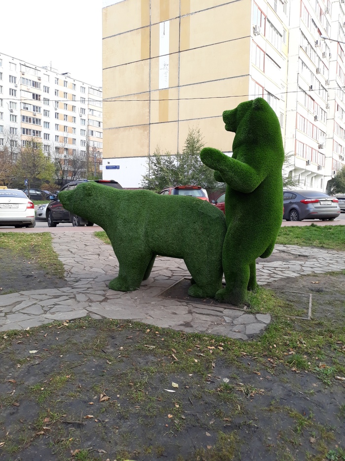 У нас в соседнем дворе тоже есть такие топиарии. Причем именно медведи, три штуки. Так вот, в один из прекрасных дней мальчишки оторвали медведя от постамента и слегка переставили XD Сфоткала на память, уже через пару дней медведя прикрутили на место. Поржала тогда знатно=)