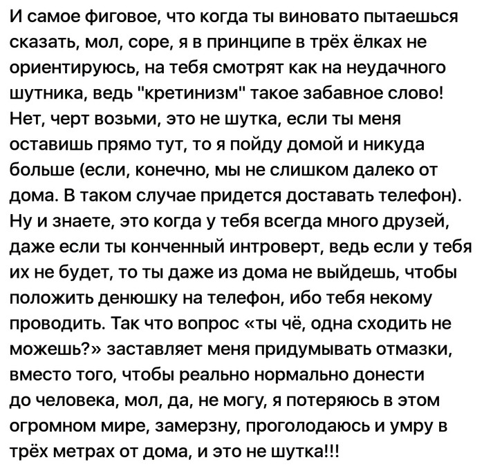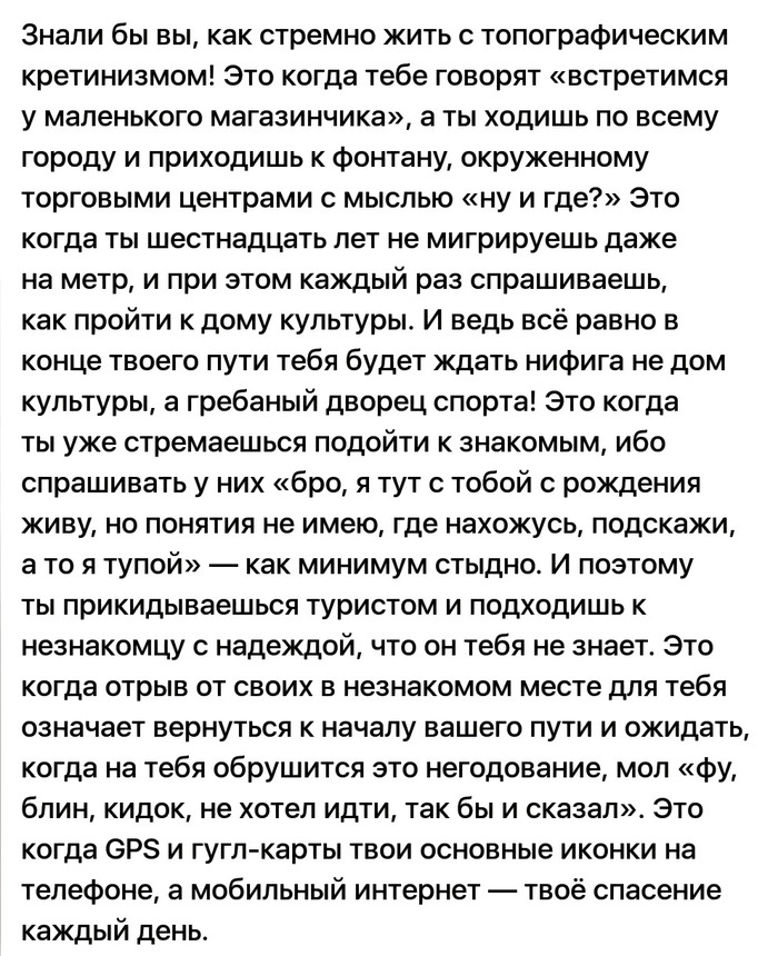 Читаю определение: "Топографический кретинизм – неумение ориентироваться на местности – до сих пор остается загадкой, которую еще предстоит изучать. Врачи упорно отказываются признавать его болезнью и советуют относиться с долей юмора"