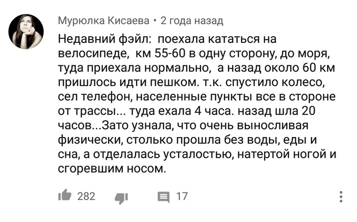 Так вот, нужно мне было документы отвести по работе, курьер уже в бегах, начальник говорит "смотайся сама, там недалеко, от метро наискосок". Ну ладно, не проблема. Выхожу из метро и сразу, чтобы исключить недопонимания разные, ищу глазами у кого бы спросить направление. Вижу, стоят трое в форме, форма не милиции (тогда еще), может охрана какая, уже не важно. Люди при исполнении, стоят тут не просто так, значит все знают. Подхожу, вежливо спрашиваю "не могли бы вы подсказать...". Меня не послали (мол мы тут не справочная), так же вежливо показали направление. Я обрадовалась, задача была совсем простая: пройти по какому-то крытому переходу с ларьками с двух сторон по всей длине. Тоннель достаточно длинный, но прямой, неправильно свернуть негде. Иду. Примерно на полпути замечаю в одном из ларьков витрину с флэшками, а мне как раз вот прям срочно надо было (отвечаю). Зашла, купила, вышла и продолжила путь. Добежала до конца "тоннеля", дальше непонятно. Надо снова кого-нибудь спросить. Верчу головой, оппа, снова стоят эти трое в форме. Интересно, как они тут вперед меня оказались? Хм. Ааа, так они наверное прошли как раз когда я в ларек забежала за флешкой. Ну чего тогда других искать, эти знакомые ж уже. Подхожу, сияя улыбкой "извините, а дальше куда?" Трое зависли, смотрят на меня, молчат. Напоминаю "ну я к вам подходила спрашивала дорогу". Один оживился " а, ну так я ж вам показывал- идете по этому переходу до конца" И тут меня как ударило, еле "спасибо" выговорила, ушла за поворот и пока не отсмеялась, с места не могла сойти. Это ж я обратно прибежала. И ведь даже тени сомнения не было))