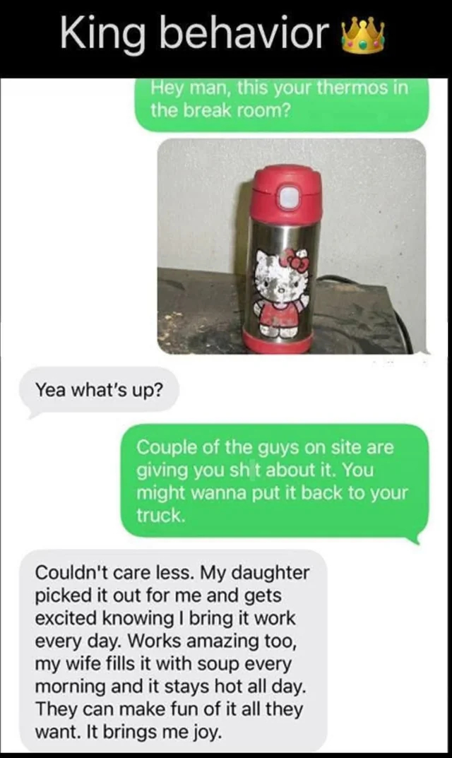 Мне вообще плевать. Моя дочь выбрала его для меня, и она так радуется, когда знает, что я беру его на работу каждый день. К тому же он работает отлично: жена каждое утро наливает в него суп, и он остается горячим весь день. Пусть смеются сколько хотят. Мне он приносит радость.