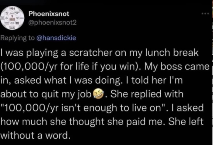 В обеденный перерыв я играл в моментальную лотерею (приз — 100 000 в год пожизненно). Зашла начальница и спросила, чем я занят. Я ответил, что собираюсь уволиться 🤣.