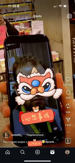 Например, есть рилс, где блогер подходит к парню-консультанту в “Золотом яблоке” якобы попросить помощи, а потом подводит его к девушке-покупательнице и спрашивает у нее номер телефона “для друга, вот он рядом стоит, вы ему очень понравились”, показывая на консультанта. Разумеется, консультант в шоке, не понимая, что происходит и как реагировать, девушка в шоке, что к ней подошли 2 парня с камерой и что-то от нее требуют.